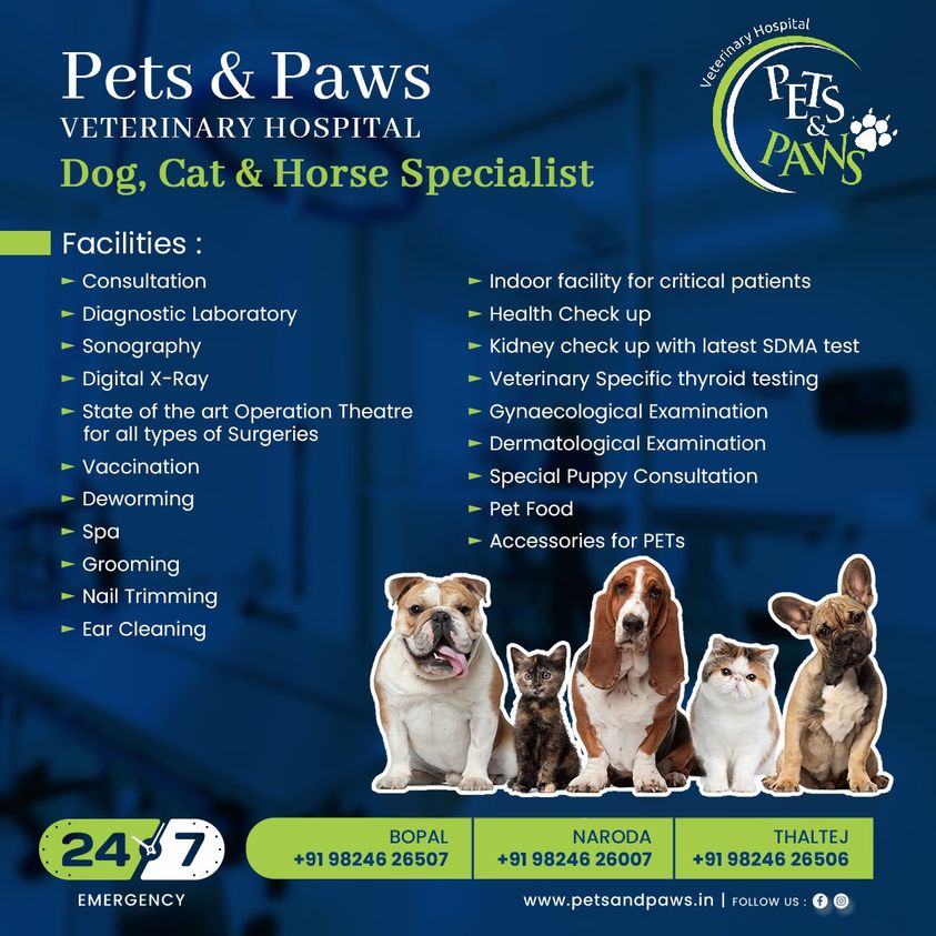 We're the most trusted veterinary hospital in Gujarat because, for us, animal care is our top priority. Pets & Paws is open 24/7, with a mission to provide the best emergency care services wherever your pet needs them.